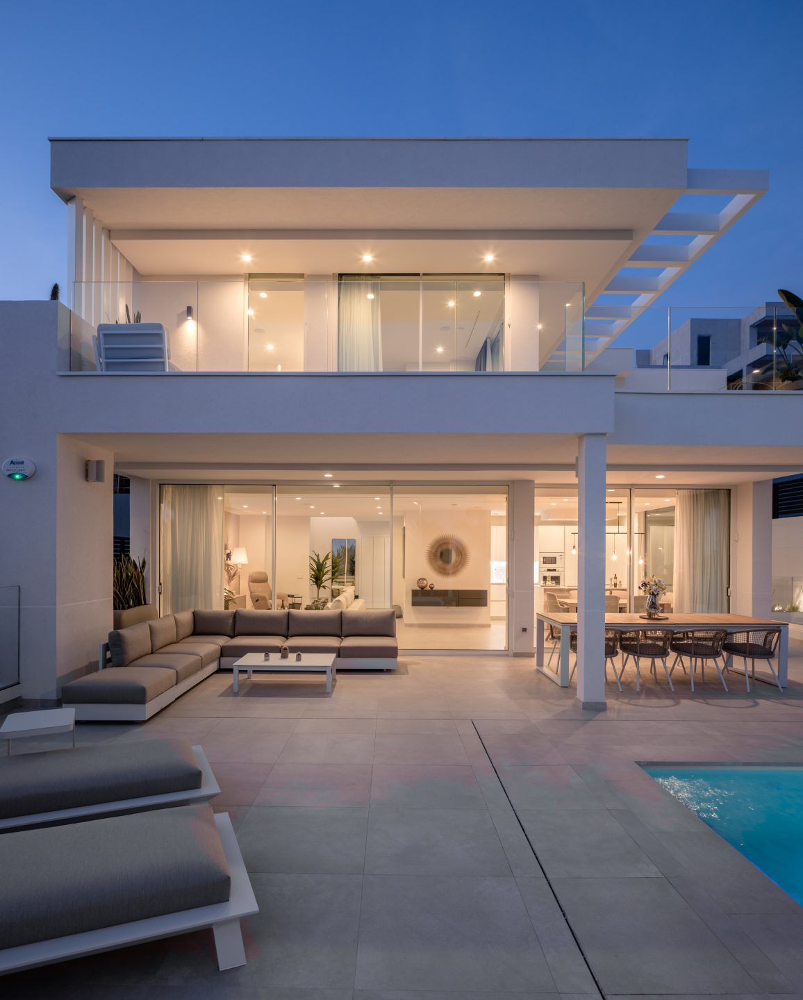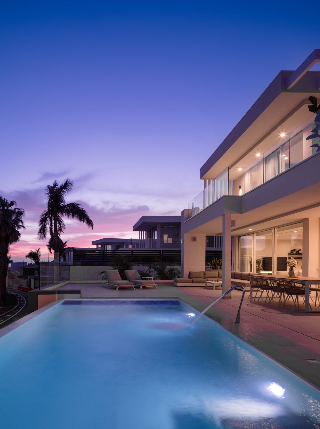 All villas have two parking spaces in the garage or in a private outdoor car park. Outside there is a spectacular 32m² heated infinity pool, as well as large terraces and verandas. The ocean is 1200 metres away.